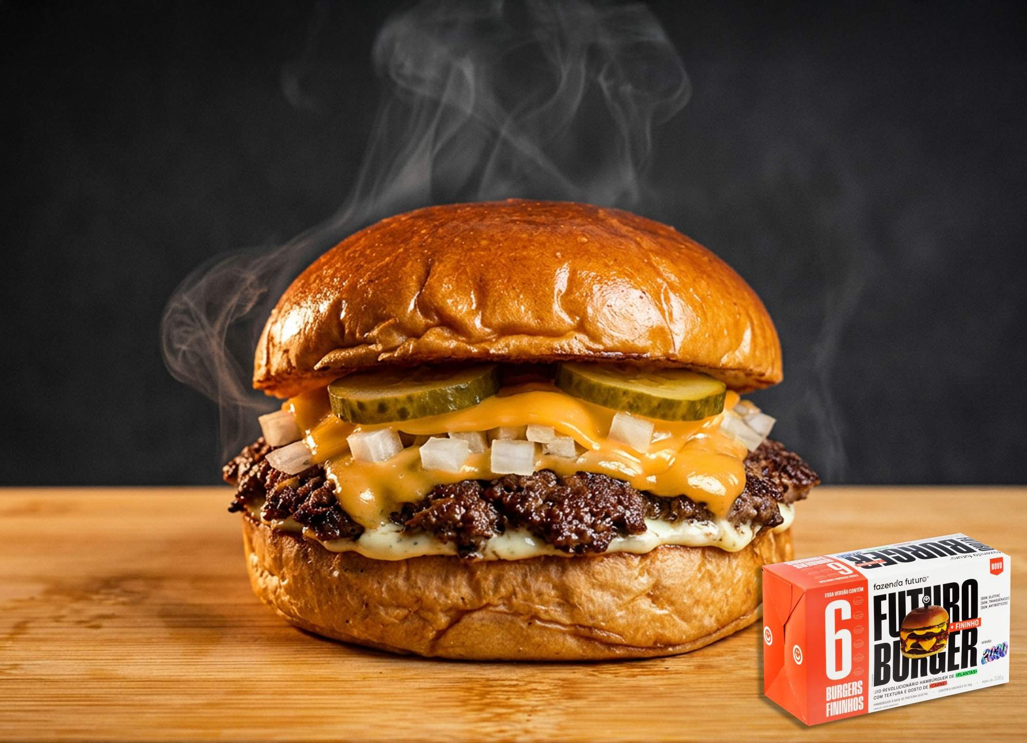 1 hambúrguer do Futuro – Futuro Burger – de 56 g feito com uma mistura exclusiva de proteína tripla de soja, ervilha e grão-de-bico no pão de brioche, 2 generosas fatias de queijo cheddar, cebola, picles e maionese.