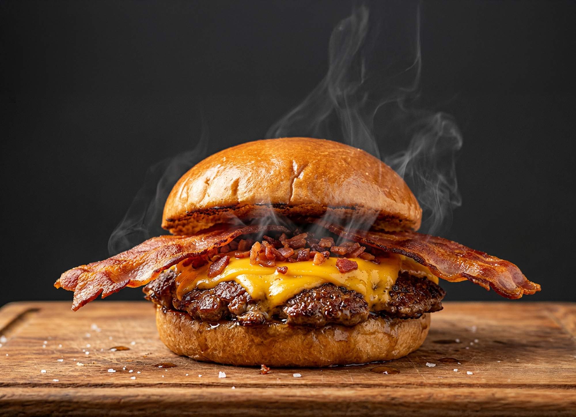 1 carne de 80 g de blend Angus no pão de brioche, 2 generosas fatias de queijo cheddar, fatias de bacon, farofa de bacon e maionese.