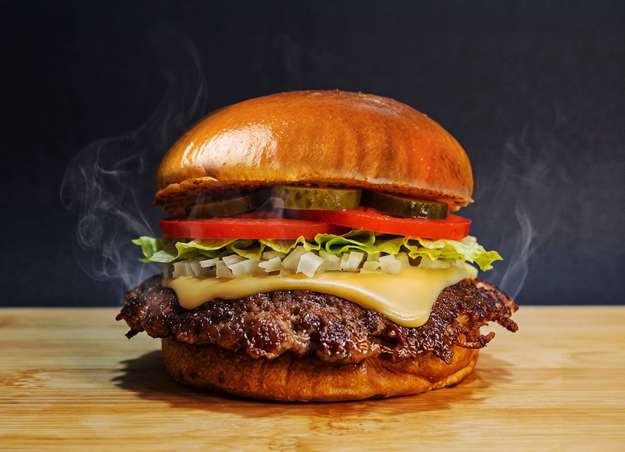 1 carne de 80 g de blend Angus no pão de brioche, 2 generosas fatias de queijo prato, tomate, alface, cebola, picles e maionese.